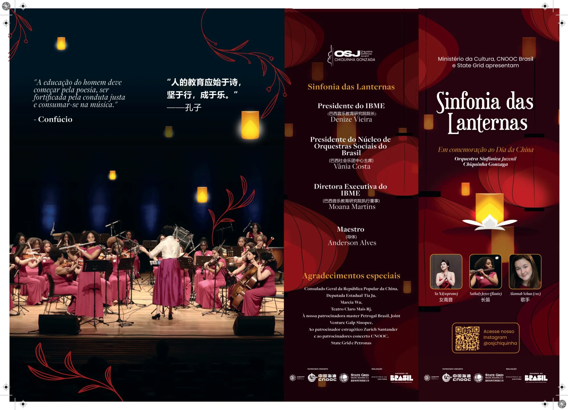 A primeira parte do concerto foi marcada pelo virtuosismo das solistas Nathaly Joyce, flautista da OSJ Chiquinha Gonzaga, e Alannah Schuu, convidada especial. Já a segunda parte transportou a plateia para paisagens sonoras do Oriente, com obras de Liu Chi, Tan Jing, Wang Zifei e canções folclóricas como Mo Li Hua, em arranjos inspiradores.