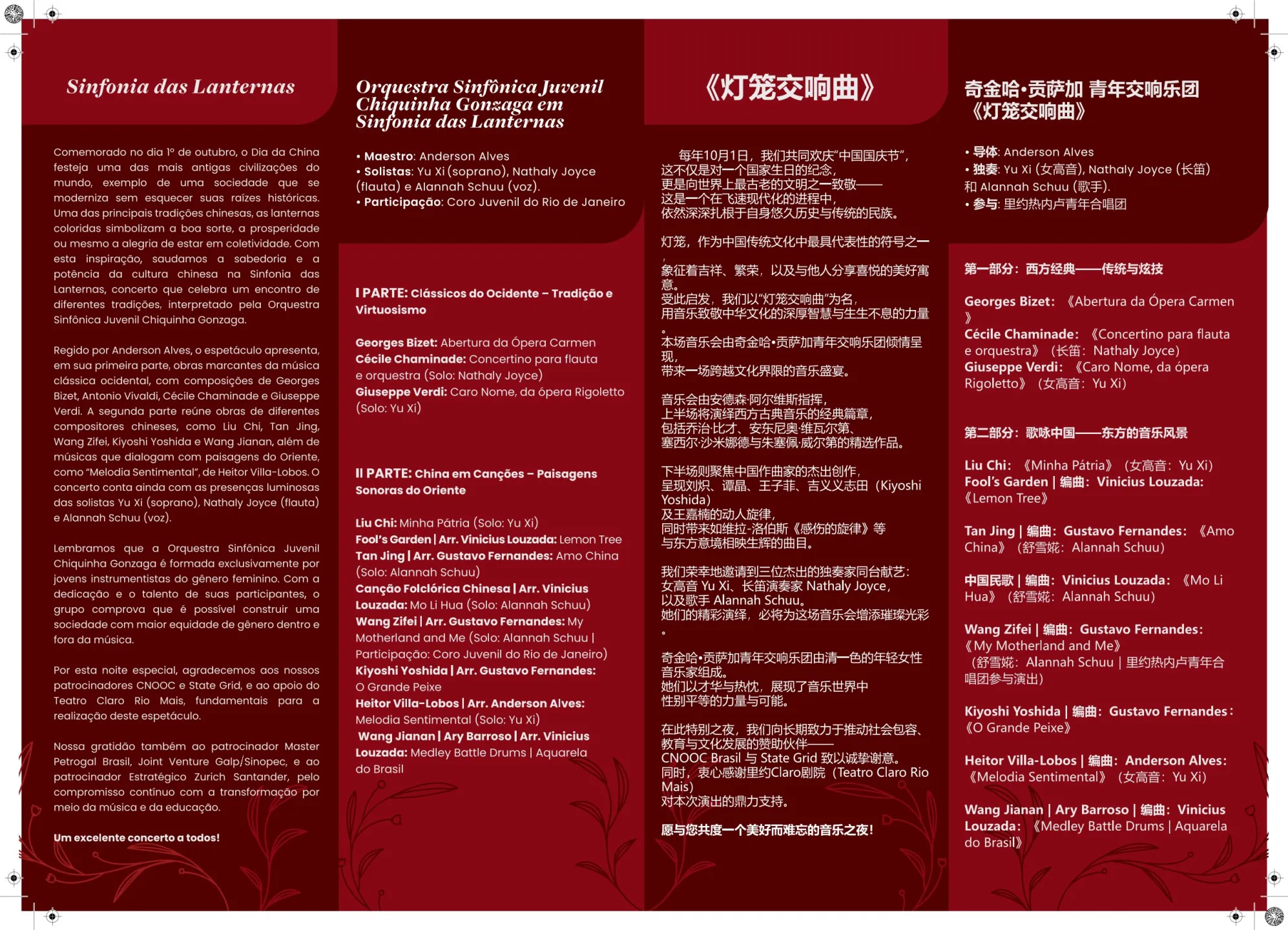 Liu Chi: Minha Pátria Fool’s Garden | Arr. Vinicius Louzada: Lemon Tree Tan Jing | Arr. Gustavo Fernandes: Amo China Wang Zifei | Arr. Gustavo Fernandes: My Motherland and Me Canção Folclórica Chinesa | Arr. Vinicius Louzada: Mo Li Hua Kiyoshi Yoshida | Arr. Gustavo Fernandes: O Grande Peixe Heitor Villa-Lobos | Arr. Anderson Alves: Melodia Sentimental Wang Jianan | Ary Barroso | Arr. Vinicius Louzada: Medley Battle Drums | Aquarela do Brasil